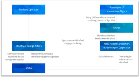 Under this measure, the government started to impose KRW 1000 (equivalent to USD1) on each departing international air ticket to fund GPEC. While the foreign minister is in charge of GPEC, KOICA would be entrusted by the said minister to manage and operate the contributions. The Ministry of Foreign Affairs also set up the ‘Deliberate Committee on the Operation of the International Contributions for the Eradication of Poverty’ to handle the contributions. Although GPEC was initially intended to last for five years only, the five-year extension bill passed the National Assembly in 2012, and it eventually became a permanent fund from January 2017. At this time, GPEC was renamed to GDEF in accordance with the Act and Enforcement Decree on the Global Disease Eradication Fund [20]. Figure 1 illustrates the flow of finances via multiple agencies.