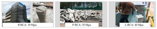 The recycled aggregate made from 3 sources was investigated (Figure 1). The first was the leftover cube concrete specimens from laboratory testing, with an existing strength ranging from 40–45 MPa. The second was the waste from the rejected product from the precast hollow core slab industry with an average strength of 35 Mpa. The last one was the building demolition waste, especially the building demolition concrete from the building of which the location interposes the new underground MRT Orange line in the capital city of Thailand. This example emphasizes the increasing demand for infrastructure renovation from the fast-growing city. The coring sample of concrete structure from the building was tested to verify its existing compressive strength which turned out to be 16 Mpa on average. B-RA, P-RA, and L-RA represent recycled aggregate from building demolition, aggregate from precast concrete waste, and aggregate from laboratory waste respectively. The concrete waste was crushed and graded according to ACI 555 []. Then, the natural aggregate concrete was replaced by L-RCA, P-RCA, B-RCA with the proportion of 30 percent, 60 percent, and 100 percent respectively as indicated in Table 1. Short-Term properties of concrete from recycled aggregate were verified in terms of strength and elastic modulus in the period of 7, 14, and 28 days. The durability of the concrete was represented by a rapid chloride penetration test (ASTM C 1202) [] at 28 day-age concrete.