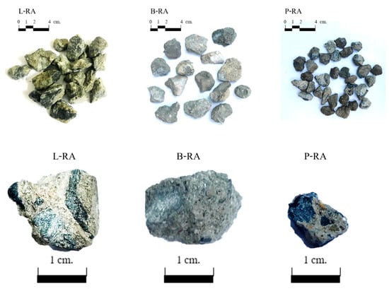 Recycled aggregate from laboratory waste (L-RA), building demolition waste (B-RA) and precast concrete waste (P-RA).