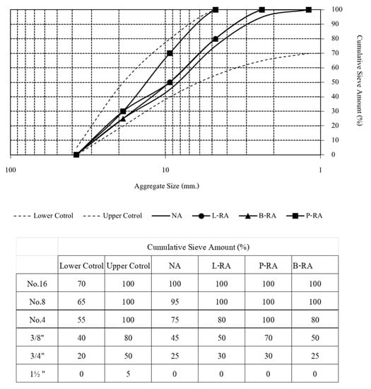 According to the test, the distribution of different particle sizes of the coarse aggregate corresponded to ASTM C135 [] Standard Test Method for Sieve Analysis of Fine and Coarse Aggregates as shown in Figure 3. However, it could be observed that the distribution of precast concrete waste of different sizes with mostly fine aggregate was higher than that of other types of aggregate.