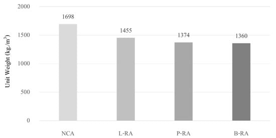 The unit weight of natural aggregate is a little bit higher than that of recycled aggregate, as represented by 14–19%. From Figure 4, the unit weight of natural aggregate was higher than that of every type of recycled aggregate. This was because there was mortar waste on the surface and the crushing process might leave the shape of the surface distorted. Moreover, the particle size of recycled aggregate was mostly at the same size range, resulting in more rooms in concrete and eventually in lower unit weight. Considering the water absorption rate, it was obvious that the unit weight of natural aggregate was lower than that of recycled aggregate. From Figure 5, the water absorption percentage of recycled aggregate was 6.65, 8.72, and 6.78 times higher than that of natural aggregate. This was because there was mortar present on the outer surface of recycled aggregate, resulting in higher porosity, lower specific gravity, and higher water absorption when compared to natural aggregate.