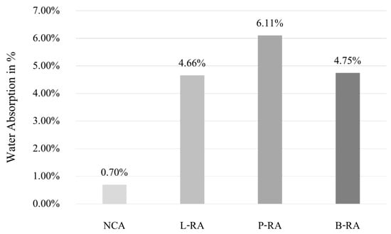 There have been studies on recycled aggregate in concrete for some time. Reliable studies mentioned the properties of concrete and the behavior of the construction from recycled aggregate concrete. They found that recycled aggregate concrete plays a significant role in water absorption in aggregate, leading to lowered permeability resistance []. The water absorption capacity of recycled aggregate concrete is considered high (>7 percent) according to the standardized measure provided by [] JIS A5002. Moreover, recycled aggregate concrete has a lower compressive strength compared to natural aggregate concrete by 21 percent []. However, if the amount of recycled aggregate in the concrete is restricted to not more than 20–30 percent of the total concrete, there is a negligible difference between the properties of recycled aggregate concrete and those of natural aggregate concrete. [] In 2014, [] Duan and Poon conducted research on the properties of concrete with mortar on the stone surface and from different sources. The result was that recycled aggregate with a little amount of mortar on the stone surface had low water absorption capacity and therefore can be a substitute for natural aggregate. Likewise, the research by [] Pedro et al., 2014 also found that the water absorption capacity of recycled aggregate was medium as represented by 3.9–7.6 percent. As a result, a recycled aggregate could be used in concrete with high compressive strength.