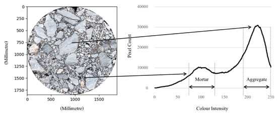 Figure 7 shown vertical cross section of concrete sample so that the properties of the concrete could be carefully examined. Then, the concrete was captured with a digital camera with at least 5 MB resolution. The image was then analyzed by the MATLAB program, in which the process involved converting the image to greyscale so that the color intensity of each element in the concrete could be clearly seen. After this process, the image was denoised. Subsequently, the area of ITZ of each element was processed. The result was the differences in color intensity, with the void being the highest, followed by mortar and aggregate respectively. In order to analyze the area of ITZ, the perimeter needed to be identified. Then, the area of ITZ could be determined by multiplying the perimeter by an average ITZ thickness.