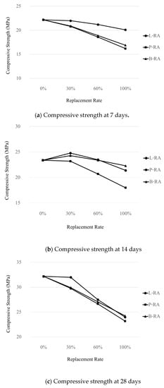 Compressive strength of concrete at 0%, 30%, 60% and 100% replacement rate at: (a) 7 days, (b) 14 days, and (c) 21 days.