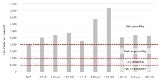 The total charge passed at 28 days of natural coarse aggregate and various types of recycled aggregate.