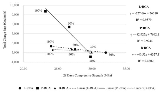 The relationship between chloride penetration and compressive strength of 28-day recycled aggregate concrete is shown in Figure 10. The decreasing penetration rate of L-RCA (Circle), P-RCA (Square), and B-RCA RCA (Triangle) corresponded with their increasing compressive strength. The effect of replacement percentage, it has a high effect on the concrete mixed with P-RCA aggregate when the ratio is increased it will increase the compressive strength and chloride permeability as well. However, for the L-RCA and B-RCA samples, it was found that the increase in the aggregate’s substitution ratio had a large effect on the compressive strength and chloride permeability. The two relationships between L-RCA and P-RCA could be explained by R2 which was well fit up to 95 percent and 99 percent respectively. Based on this result, it can be confirmed that linear regression relationship between compressive strength and chloride penetration. However, as for aggregate from the precast slab waste, the chloride penetration rate tended to be very high, which was indirectly proportional to the compressive strength. On the other hand, when considering the water absorption of P-RCA aggregates, it is found that higher water absorption rates than other aggregates have a reliable effect on the absorption values. The passivity of chloride was also higher. This highlighted the sensitivity to a change of compressive strength which significantly affected the porosity of this type of recycled aggregate.