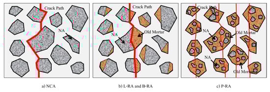 The aggregate porosity played a vital role in how the crack occurred, which also directly affected the compressive strength of the concrete. Ref. [] Normally, the crack path advances through aggregate, mortar, and ITZ, depending on the ability to handle the strength of each part as shown in Figure 11. In natural aggregate concrete (NCA), the crack path went through the mortar and ITZ around the aggregate. In contrast, in laboratory waste (L-RA) and building demolition waste aggregate concrete (B-CA), it was possible for some crack paths to go through the previously existing ITZ, which occurred between some of the previously existing mortar and aggregate, while other crack paths might go through the new ITZ, depending on which ITZ could bear higher strength. This result is explained by research from Li et al. [] which found that old mortar is the weakest of Recycle Concrete Aggregate. If the parent strength of recycled aggregate is high, the ITZ might be able to handle more strength. Lastly, in precast slab waste aggregate (P-RA), due to high porosity in this type of aggregate, which resulted from the use of small-sized stones and in turn leading to a larger area of ITZ. Thus, the crack path could go through its ITZ much more easily compared to the other two.