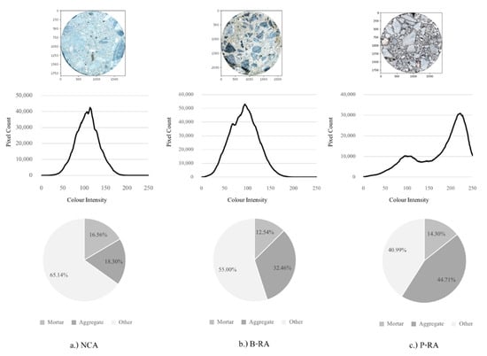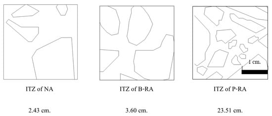 Photos from an image processing technique showed the area of each phase as shown in Figure 12. In the first row are raw photos which were denoised. The photos in the second row show the phase distribution in the cross-section area of the concrete after using an image processing technique. Finally, in the last row are the percentages of each phase of NCA, B-RA and P-RA. The phase of NCA and B-RA showed a similar distribution, unlike that of P-RA. To elaborate, the phase area of P-RA aggregate was nearly twice that of NCA and B-RA. The larger phase area of P-RA resulted in the increase in ITZ. The length of ITZ was determined by drawing a line in the CAD program as shown in Figure 13. Then, the area of ITZ of concrete cross-section was identified by multiplying the length of ITZ by its thickness 40 µm on average based on the research by Zouaoui et al. [] which proposed that the ITZ thickness ranged from 30–50 µm.