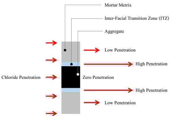 Figure 14 demonstrates the schematic of chloride penetration through the cross-section of concrete. Chloride could penetrate the mortar to certain extent, but could penetrate the ITZ area better, while chloride could barely penetrate or could not penetrate the stone area at all. According to the research by Silva et al. which investigated the relationship between the total charge passed and chloride migration coefficient based on 120 studies, the relationship between these two is linear as presented in the equation below