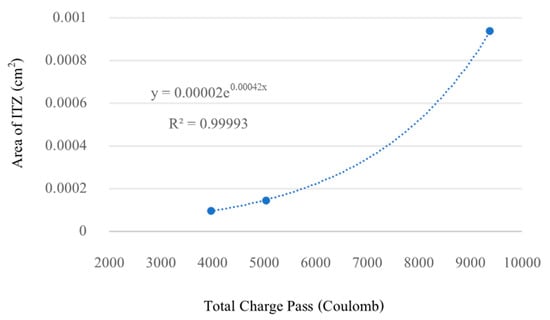 The relationship between the ITZ area determined by the calculation above and the total charge passed was exponential. To illustrated, the area of ITZ obtained by an image processing technique played a crucial role in the amount of chloride penetration in exponential relationship which R2 = 0.9994 (Figure 15). This also directly affects the concrete durability in accordance with the research by Azarsa and Gupta [].