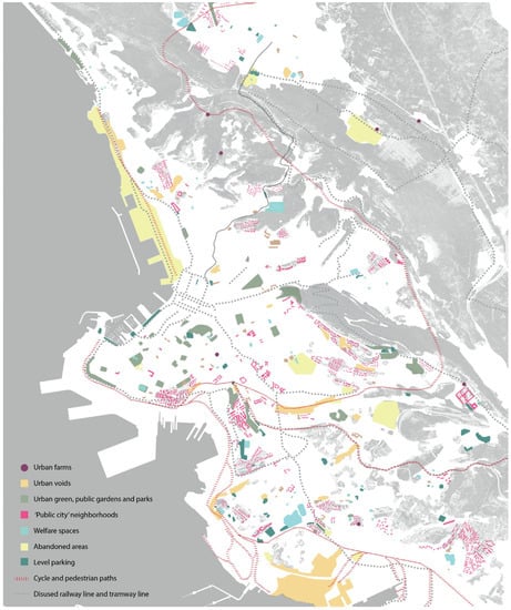 Trieste, together with other cities of the Friuli Venezia Giulia region, has been a significant case study for the local research unit, a context in which to test the hypotheses set out in the premises to the research project and the guidelines that derived from it [71]. The use of participatory observation tools, qualitative field surveys and map readings has allowed for the assemblage of maps for the identification of resources and potential in the survey contexts. Readings and interpretations of the public city built with the help of local actors were the starting point for experimenting with different forms of an urban and territorial project guided by the principles of resilience and social justice.