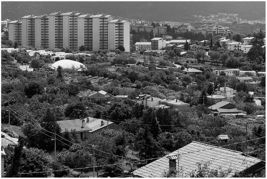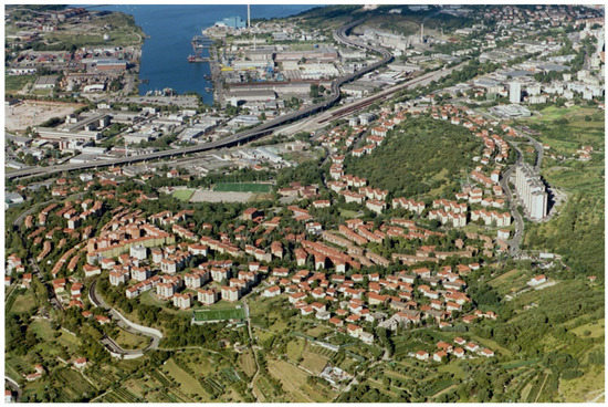 The following experience specifically concerns one of the large neighbourhoods in the south-eastern outskirts of Trieste, Borgo San Sergio [72,73], built between the 1960s and 1970s on a project by the well-known Milanese architect of Triestine origin, Ernesto Nathan Rogers, to respond to the serious housing needs of the second post-war period [74] (Figure 2).
