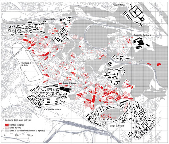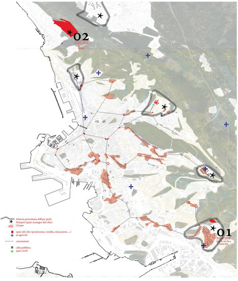 A final consideration should be dedicated to the opportunity that processes of food system rescaling and suburb regeneration offer us to rethink the relationships between built and open spaces through the design and organization of an innovative service frame between city and countryside [95] whose effects can extend to larger parts of the city, too. The frame figure refers to the designing of a light, continuous and flexible infrastructure, which, starting from the peri-urban areas, can infiltrate the city by exploiting public districts’ porosity. The main role of this infrastructure is to support the maintenance of urban and peri-urban forms of agriculture through fixed and mobile equipment that includes places of storage, processing, distribution, consumption, education, etc. At the same time, this seamless system made up of paths and open and built spaces in support of agrifood micro-chains can also respond to social and welfare needs if existing or planned welfare spaces are included in it. The frame is configured as a set of places in which more and less fragile subjects can find their chances for social cohesion and concrete opportunities to improve their health conditions.