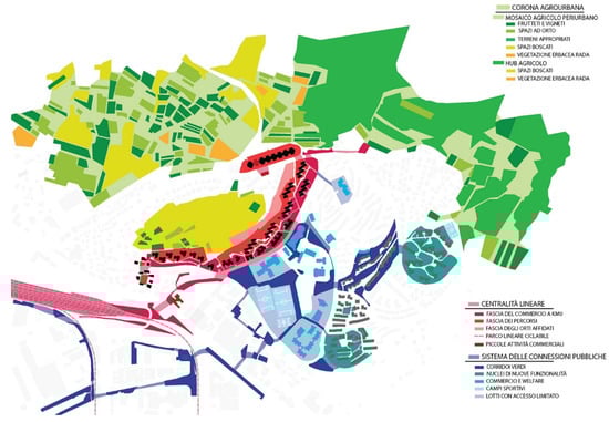 In summary, the Masterplan refashions Borgo San Sergio as a ‘hinge space’ where physical and functional transitions between the city and the peri-urban countryside surrounding Trieste can be redesigned. By exploiting the porosity of the neighbourhood and its many open spaces, it is possible to configure space systems between urban and rural areas with a high ecological-environmental value. Precisely in these systems, it will be possible to experience agricultural multifunctionality [80] and, more specifically, the potential of peri-urban cultivated areas in producing ‘civil food’ through the construction of inclusive and sustainable micro-supply chains [57,81] to promote greater social integration and improve the quality of living and open spaces.