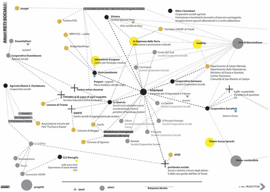 In order to work on all the hypotheses set forth by the OdM project, some research steps were fundamental. A first step was aimed at reconstructing and reading the existing food network of this context. To observe the ‘food network’ meant to recompose the system of relationships between actors of the agrifood system on an urban scale (in this case, the city of Trieste) and to verify whether there were chances to reorganize this system using innovative resilient models able to adapt to sudden changes, as has happened with the recent pandemic, thus creating the conditions for the consolidation of short food cultivation-distribution chains (Figure 7).