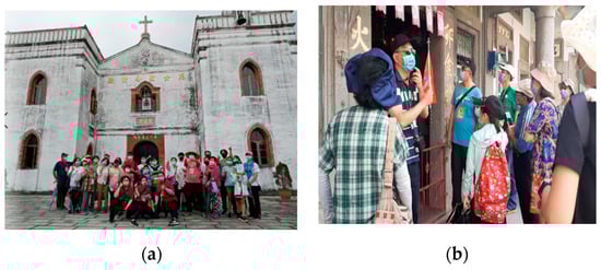 Sustainability learning activity through rural community travel: (a) Wanjin Basilica, the oldest Catholic church in Taiwan; and (b) The biggest traditional Hakka cultural settlement in Taiwan. All the learners paid attention and listened to how sustainable development can be a part of community and human involvement. One of authors was the tour guide (center of photo (b)).