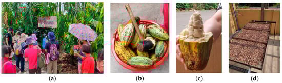 Tour of a cocoa farm by a farmer who provided low-carbon service. DiRaja Chocolate is the brand name of small cocoa farmer in Taiwan. They have received several certifications labeling them as non-toxic chocolate masters who have adopted friendly environment farming conditions. The small cocoa farmer provided tourists sensory services to help them appreciate the cocoa produce. This fit the goal of sustainability learning activity through rural community travel. (a) The cocoa farm visited by the tourists; (b) Cocoa fruits with hammer used to peel the fruit; (c) Opened cocoa fruit in tourist’s hand; and (d) Cocoa beans dried in the sun.