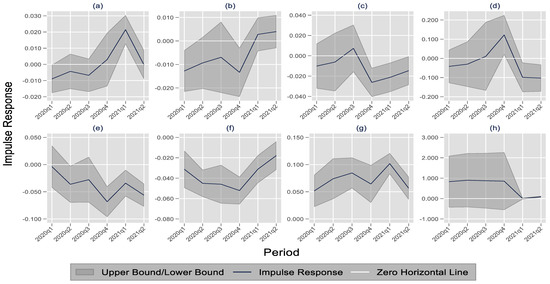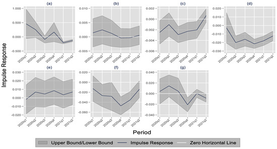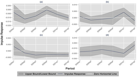 From Figure 2, it is shown that the shock of the COVID-19 pandemic decreased the FDI in the subsector of the non-metallic mineral industry for all quarters during the 2020–2021 period. Furthermore, the shock of the COVID-19 pandemic reduced FDI in the textile, leather goods, and footwear industry in quarter 1 and quarter 4 of 2020; in the wood industry in quarter 4 of 2020 and quarters 1–2 of 2021; in the paper and printing industry in quarters 1–2 of 2021; and in the chemical and pharmaceutical industry, as well as the rubber and plastic industry, in quarter 2 and quarter 4 of 2020 and quarters 1–2 of 2021.The results indicate that the impact of the COVID-19 pandemic on FDI was not the same for each subsector in the manufacturing sector.