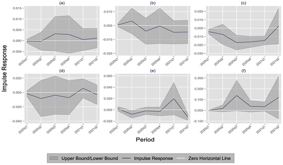 Impulse responses of FDI to COVID-19 pandemic in Indonesian regions. Notes: (a) = Java. (b) = Sumatera. (c) = Kalimantan. (d) = Bali and Nusa Tenggara. (e) = Sulawesi. (f) = East Indonesia.