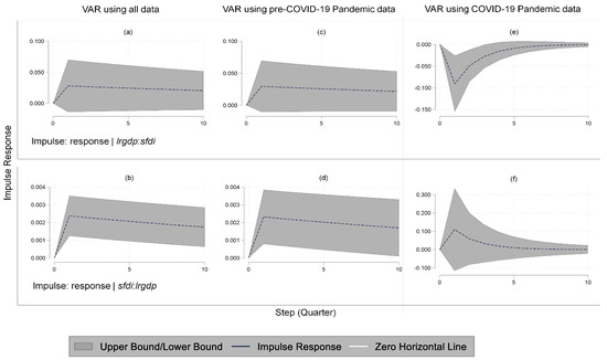 Impulse responses function of GDP and FDI. Notes: (a) and (b) = Impulse response using all data; (c) and (d) = impulse response using pre-COVID-19 pandemic data; (e) and (f) = impulse response using COVID-19 Pandemic Data.
