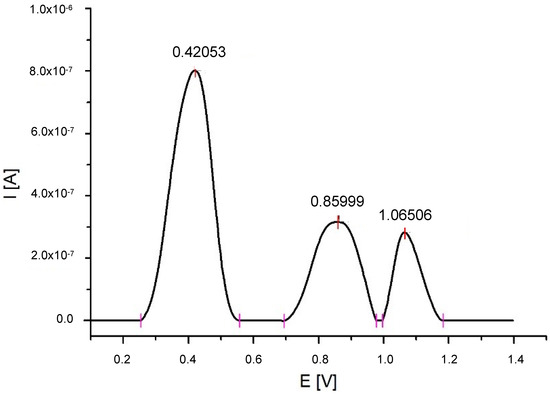 Electrochemical measurements revealed the presence of three SWV signals located in the +0.42, +0.86, and +1.065 V regions. The signal in the +0.42 V region had the highest values of current.