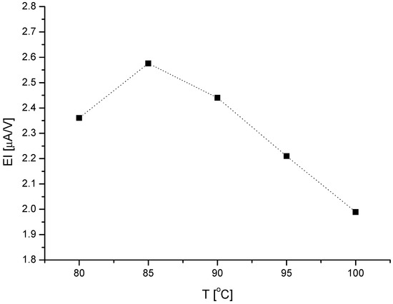 Table 1 compares the electrochemical parameters determined for the studied extracts based on three replicate measurements. The RSD (Relative Standard Deviation) value for successive replicate measurements ranged from 1% to 5%. Considering the values of the current and potential of the individual peaks visible on the SW voltammograms, the electrochemical index (EI) was calculated for each extract. The peak current is directly proportional to the antioxidant activity, while the peak potential is inversely proportional, therefore the calculation of EI provides a useful parameter of antioxidant power of the analysed samples [14]. The relationship between the EI value and the applied temperature of extraction is shown in Figure 2.