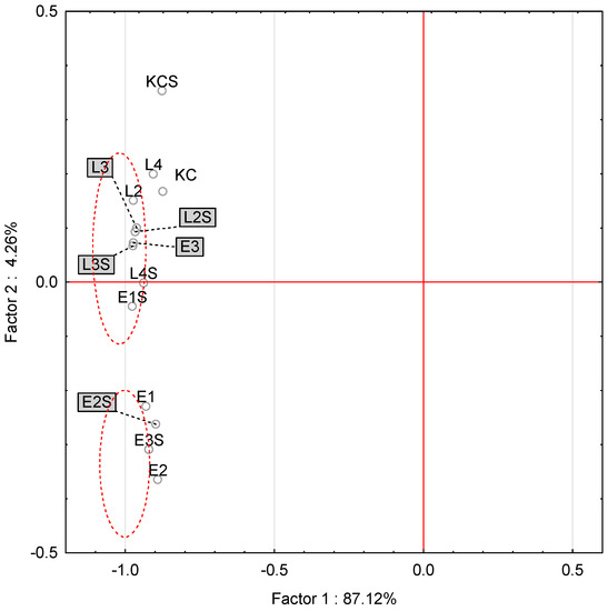 Bread was tested immediately after baking and after 5 days of storage. Bread samples were stored in a closed foil packet. Stored bread with oregano extract was determined as E1S, E2S, and E3S and L2S, L3S, and L4S (bread with dried oregano leaves), respectively. The stored control sample was determined as KCS. The studied bread was dried at 60 °C to a constant mass. Then, it was ground using a Retsch GM200 laboratory mill (5000 rpm/s pulse for 10 s). Such prepared samples were extracted via the accelerated solvent extraction (ASE) technique using a Dionex ASE 350 extractor (Thermo Fisher Scientific, Waltham, MA, USA). The extraction was performed three times: first with 60% methanol at 20 °C, then twice with distilled water at 85 °C. The results are shown as the absorbance value.
