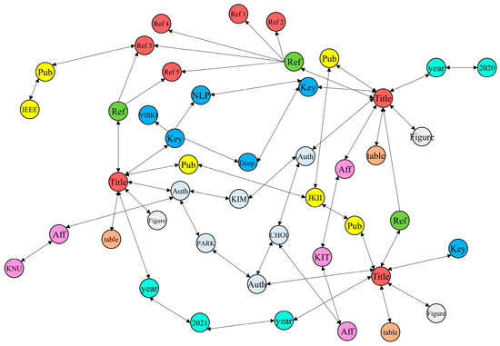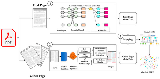 Knowledge graphs (KGs) are promising enablers for effective decision support systems [1]. Most KGs comprise large quantities of triple sentences, representing vast knowledge, but building a well-equipped KG is challenging due to technological limitations and expensive human evaluation. The KG mainly extracts triples by implementing domain-specific entity name recognizers and relationship extractors to extract concepts (or entities) and identify relevant relationships between the concepts. Internal KG structures and hence their construction performance differ significantly depending on target entity types and relationship granularities [2,3,4,5]. For example, PubMed KG [6] connects bio-entities, authors, articles, affiliations, and funding from approximately 29 million PubMed abstracts. Although BioBERT [7] based entity extraction outperformed the previous state-of-the-art (SOTA) models, it only achieved F1-score = 51%, which is far from ideal. Mondal et al. [8] recently proposed SciNLP-KG, an end-to-end natural language processing (NLP) KG construction with 30,000 NLP papers focusing on four extracted relationship types among tasks, datasets, and evaluation metrics. However, their relationship extraction modules still only achieved an F1-score < 80%. Liu et al. [9] defined a metaknowledge architecture to construct structural knowledge with documents, in contrast with previous KGs but similar to the present paper’s approach. They employed a multi-modal metaknowledge extraction model to extract and organize metaknowledge elements (e.g., titles, authors, abstracts, and sections) from a government policy document dataset and DocBank [10] dataset. However, due to the computer-annotated data quality, the experiments on the DocBank are just performed with image features rather than multi-modal.