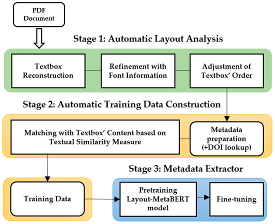 We adopted our prior work, LAME framework to discriminate metadata elements in the first document page, considering text block characteristics in the heterogeneous meta-information layouts [13]. Figure 2 shows that the LAME framework comprises three major components: automatic layout analysis, layout-aware training data construction, and metadata extraction. Stage 1 analyzes the PDF’s first-page by using PDFMiner, then is subject to reconstruction, refinement, and adjustment procedures to identify the various metadata on the first page due to incomplete PDFMiner parsing results. Stage 2 builds the many training datasets used in Stage 3. The building process matches identified metadata from Stage 1 with previous correct metadata values. However, the compared textual content is not always precisely matched. Therefore, to determine the extent of the match, we allowed only fields with almost identical (or high similarity) matches for each layout text information element automatically acquired in the previous step as training data. We used a mixed textual-similarity measure for efficient computation based on the Levenshtein distance and bilingual evaluation understudy (BLEU) score.