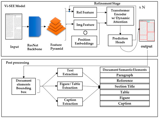 Figure 3 describes the proposed Vi-SEE model, which utilizes ISTR [36] to detect objects in pages in the PDF document except for the first page. Images from the PDF pass through the ISTR based detection model to identify candidate bounding boxes (BBoxes) for text, titles, lists, figures, and tables. Input image passes through the convolution natural network based on the reset backbone, produces a feature pyramid. RoI (Region of Interest) feature and image feature are separated from the feature pyramid, and image feature and position feature are concatenated. Moreover, transformer encoder with dynamic attention fuses the image + position and RoI features for prediction head. Each detected area is converted into actual data through a set of post-processing procedures using the detected BBoxes corresponding categorical labels: (1) text extraction for text, lists, and titles, (2) figure/table extraction, and (3) caption extraction. Previous studies have only performed this at area-level detection, whereas the proposed modules include detailed techniques to extract precise regions for semantic element areas and related texts.