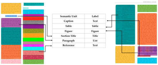 (1) Five major semantic elements (i.e., section title, paragraph, reference, table, and figure) were pseudo-labeled for the 70 scientific journal articles using the Mask-RCNN [28] model trained with the PubLayNet [26] dataset following COCO data format [50].