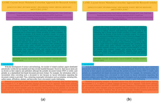 - Choi, J.; Kong, H.; Yoon, H.; Oh, H.-S.; Jung, Y. LAME: Layout Aware Metadata Extraction Approach for Research Articles. arXiv 2021, arXiv:2112.12353. [Google Scholar]