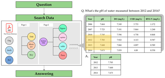 Employing a table QA (Question-Answer) module [55] and mathematical reasoning injection [56] allows the user to obtain average pH between 2012 and 2014. Rather than simply providing the information, the average value is computed using the language model’s mathematical reasoning capability. Furthermore, several tables extracted from two or more document types in the same field can be processed and provided to suit the user’s requirements.
