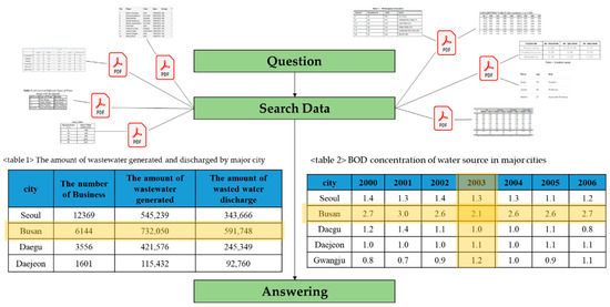 For example, suppose a researcher wants to know Busan’s BOD (the degree of contamination by organic substances) in 2003 and wonders if the distribution of pollutants affects BOD. In this case, SEKG finds a table of BOD content in water pollution-related documents, as shown in Figure 10, Table 2, which contains the content for Busan in 2003. For more complex questions, SEKG may search the pollutant distribution table (Figure 10, Table 1) and provide pollutant distribution for Busan (Figure 10, Table 2). Thus, various information comprising tables, figures, and statistics can be provided to suit user requirements regardless of specific fields and data quantities, by analyzing, processing, and combining data beyond simple information provisioning.