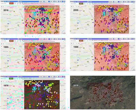 The data for assessing spatial–temporal conversions in the LULC were retrieved through the Google Earth Engine (GEE). The GEE is a cloud-computing platform that offers high-resolution aerial imagery without financial costs. In addition to this, the working environment in the GEE also facilitates classification and ensures validation. Therefore, the technique was deployed and assessments were made by improvising codes in the GEE platform (Google Earth Engine, 2012. URL: https://earthengine.google.com; Accessed on 1 May 2016) [42]. The evaluations pertaining to LULC changes were formulated by deploying supervised classifier algorithms on each of the five (05) chosen Landsat images, which covered a period of forty years (1976–2016).