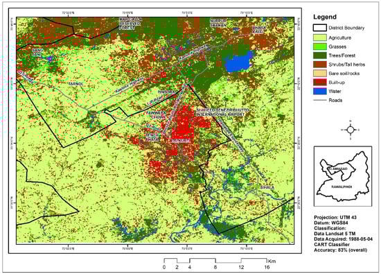Figure 6 construes about the ensuing urban densification in the study area. The phenomena caught momentum around the CBD, i.e., Fawara Chowk, in Rawalpindi. The urban expansion during 1976–1988 in Rawalpindi was more inclined towards Islamabad. Figure 6 also depicts the creeping urban sprawl and LULC transformations in Islamabad. The proportion of built-up areas significantly increased during this time in Islamabad. However, the impacts of urbanization and associated LULC changes during 1976–1988 were concentrated around the urban core areas in both urban settlements. The other land cover classes registered no noticeable fluctuations during this time.