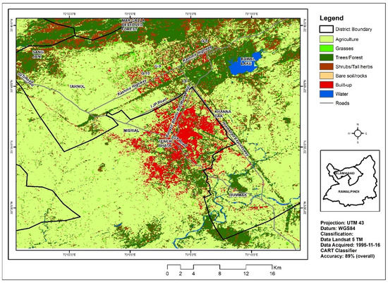 The findings (Table 3) and illustrations (Figure 10) also infer about substantial increases in the proportions of cropland and trees/forested areas during 1988–1995. The increasing demand and high prices of vegetables in twin cities due to population growth (Appendix A) seem to be the plausible cause that motivated the farming communities to convert the shrubby areas into farming lands. The provisioning of agricultural machinery for land management by the Agency for Barani (rain-fed areas) Area Development (ABAD) facilitated such conversions. In addition to this, the awareness emanating through the Arid Agricultural University in Rawalpindi also contributed to these transformations. Consequently, agricultural land expanded in the cities which were previously dominated by natural grass, shrubby and herbaceous land covers. These observations infer that access to technology and awareness suggestively influence the speed and scale of LULC changes. During this time span, the share of tree covers also increased (Table 3). During this time period, an independent Ministry of Environment at the federal level was established [78]. The ministry facilitated efforts for promoting awareness regarding ecological resources. As a result, the efforts for enhanced cooperation with donor agencies and multinational entities ensued. The local governments, specifically the Capital Development Authority (CDA), benefited from such newfound opportunities. Consequently, the portion of green areas increased in Islamabad and Rawalpindi.