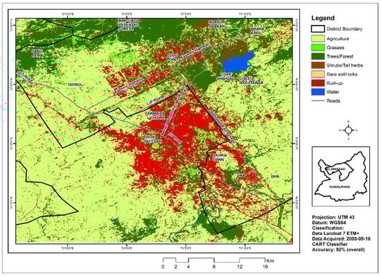 The phenomenal increase in the proportion of built-up surfaces (Table 3) in recent years (2005–2016) reflects the cumulative impacts of population growth [72,73] and socioeconomic restructuring of society in Pakistan [74] due to the consequential impacts of wars against terrorism. The precarious security environment in and around the adjoining areas of Khyber Pakhtunkhwa (KPK) forced their populace to migrate [75]. A substantial proportion of these migrants subsequently settled in the study area. Resultantly, the rental and real estate value of property increased. The land developers, in connivance with the local administration and real estate agents, encroached on the productive agricultural land and converted it into built-up surfaces. For this purpose, they promoted the lifestyle of ‘gated communities’ in the outskirts of the study area. The concomitant socioecological complexities associated with urban densification compelled the resourceful residents to move to these newly introduced gated localities [76]. The private sector initially focused on barren/nonproductive agricultural lands due to their low market value. However, for attracting potential buyers, they focused on planned urban greenery and encouraged tree plantations within their jurisdictions. It is evident by the fact that, despite all pressures for land conversions, the proportional share of urban trees and forestry increased in the study area (Figure 10). It transpired that awareness regarding environmental sustainability productively contributed towards ecological resilience. However, increases in the shares of bare soil/rocks (Figure 10) were also due to investments in the housing sector for anticipated profits from real estate transactions. Land developers converted productive land into residential plots, but on most of those plots, houses have not yet been built. The scenario entails stringent regulatory control for the sustainability of land resources in the study area.