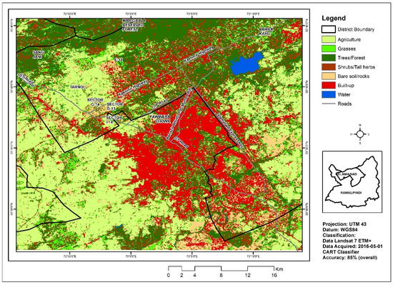 The magnitude and speed of urbanization in Pakistan [64] have caused land and environmental degradations in urban areas [23,24]. The scenario entails comprehending the dynamics of urbanization and identifying resultant impacts on the urban land cover of Pakistan. It requires conclusive assessments based on spatial–temporal transformations in the LULCs of urban areas. For this purpose, the current investigation was designed to evaluate the impacts of urbanization on the selected LULC categories of planned and semiplanned (Table 2) urban centers.