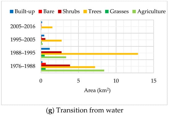 Assessments were made to ascertain the magnitude of increases or decreases in the share of a specific LULC class (Table 4). The appraisals were relied upon for magnifying the impacts of urbanization on interclass convergences and transitions (Figure 10). In addition to this, the quantitative assessments also enabled us to identify the factors responsible for the observed transformations from 1976 to 2016.