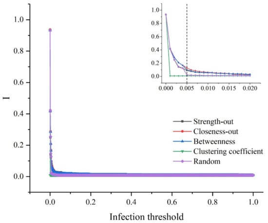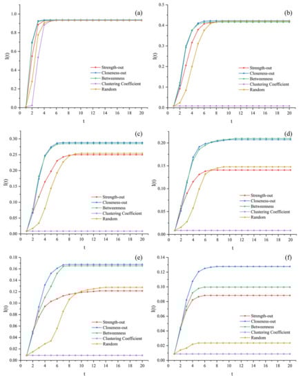 Compared to the randomly selected sectors, the sectors with high strength-out, closeness-out and betweenness generally had better performance in the selected six scenarios. Especially in the high infection threshold scenarios, the influence spreading process might not happen if randomly selecting some sectors as the policy targets (Figure 3d–f). This indicated that it is reasonable and necessary to select some important sectors as the policy targets. The special positions of these sectors in the supply chain would be helpful for the influence spreading of the related policies. Among the selected four capabilities of sectors in the global embodied carbon emission flow network, Figure 3a–f shows that the sectors with high betweenness and closeness-out had good spreading performance. With the increase of the infection threshold, the advantage of these sectors became more and more significant. However, the sectors with high strength-out did not perform as well as the sectors with high betweenness and closeness-out. Although these sectors had important direct relationships with neighbor sectors, the influence might be limited based on the full industrial chain perspective. Otherwise, the spreading process did not happen if the sources had a high clustering effect in the network, according to Figure 3. This might be because the influence is limited within the clusters rather than spreading to the outside of clusters.