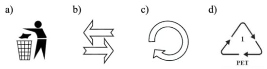 Chosen types of eco-labelling: (a) dispose of according to the local regulations, (b) reusable packaging, (c) packaging suitable for recycling, (d) packaging material type: 1—poly(ethylene terephthalate). Source: (a) ČSN 77 0053 Packaging—Packaging waste—Instructions and information on manipulation with used packaging, Obaly—Odpady z obalů—Pokyny a informace pro nakládání s použitým obalem [60]; (b–d) Ordinance of Minister of Environment on the templates of packaging labelling of 3 September 2014 [61].