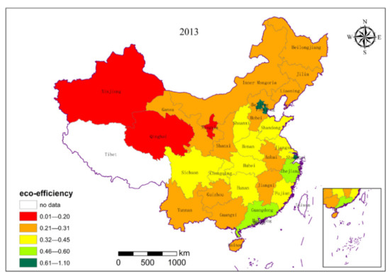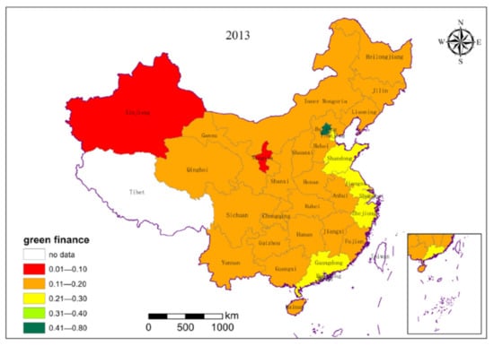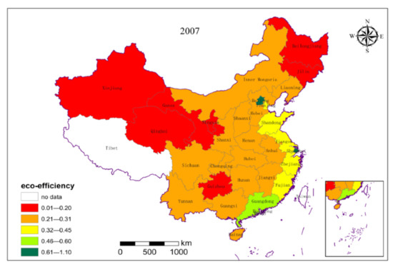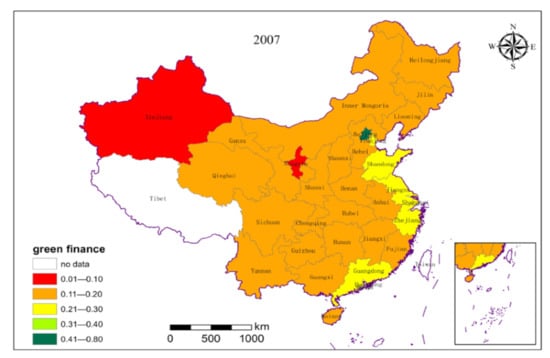 We naturally grade eco-efficiency and green finance index of China’s provinces in 2007, 2013 and 2019 using ArcGIS software, as shown in Figure 2, Figure 3, Figure 4, Figure 5, Figure 6 and Figure 7.