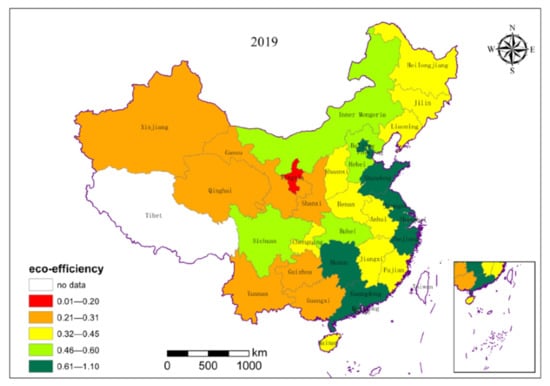 Green development emphasizes not only economic output but also environmental protection, with the core feature to achieve higher economic output with the least resource input and environmental pollution as possible. In the existing literature related to green development, similar concepts involved are eco-efficiency [35,36,37,38], environmental efficiency [39,40], and green economic efficiency [41,42]. On this basis, taking into account the core characteristics of green development of the existing literature, the regional eco-efficiency will be selected as the measure of regional green development. As a nonparametric method, the form of the frontier production function is not needed by data envelopment analysis (DEA) [43], which can effectively deal with multiple inputs and outputs. In addition, the effectiveness has nothing to do with the units of the variables. Therefore, we use the super-efficiency slacks-based measure (SBM) model [44], which is an extended model based on the DEA method combined with the window analysis to measure the comparable eco-efficiency of the 30 provincial administrative regions from 2007 to 2019 in both cross-section and time series, which has been used in Ye et al. [38]. A more detailed understanding of the principle and advantages of this method will be given in Section 3.1.1 and Section 3.1.2.
