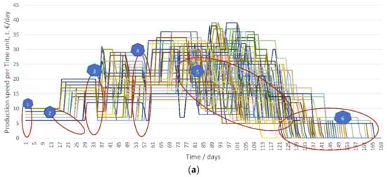 Assume that, in the project shown in Figure 6a,b, on the right are references to the ideal state for a selection of several other projects (e.g., technology, construction, etc.). The compared project in Figure 6b on the left needs substantially higher changes in production speed than project Figure 6b on the right. The requirements for changes in production speed demand costs, qualified management, and time to implement. The project in Figure 6b on the left does not have matched production rates. It indicates higher costs and more difficult management.