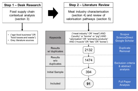 (“valorisation” OR “animal by-products”) AND (“muscle” OR “fats” OR “bones”) to obtain specific valorisation processes for each animal by-product considered in the study.