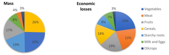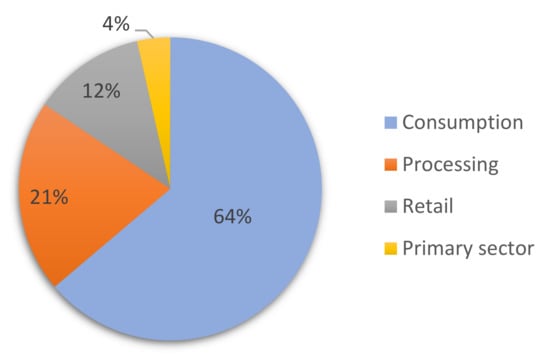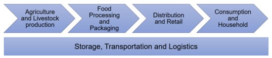 Agriculture and livestock production are the beginning of the FSC and are responsible for about one-third of the world’s food loss and waste. The losses at the primary sector are higher in developing countries than in developed ones, and they are mainly the result of a lack of technology development in operations, such as harvesting, transport and storage, and insufficient infrastructure [31].