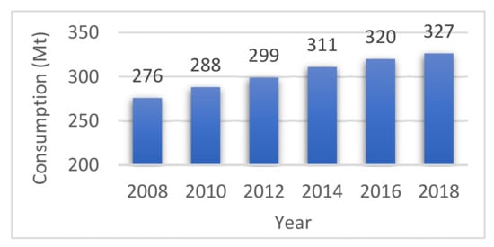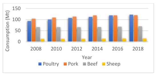 Meat is the most valuable livestock product, and the meat industry includes all of the steps from the production of livestock to the distribution and marketing of meat products. Over the last several years, the consumption of these products has been increasing (Figure 6) due to several reasons, which could be economic, such as the liberalisation, declining prices and globalisation of food systems; demographic, such as urbanisation and the increase in the world’s population; or due to nutritional trends [3,4]. Overall, global meat consumption registered a compound annual growth rate (CAGR) of 1.6% over the last 15 years. The most consumed fresh meat and meat products are derived mainly from poultry, cattle and pigs. Currently, poultry is the most consumed meat in the world (Figure 7) due to the lower production costs, which lead to lower retail prices than beef or pork [45], and due to greater awareness in reducing the consumption of red meat, since it is a high-fat food and potentially carcinogenic for humans [46].
