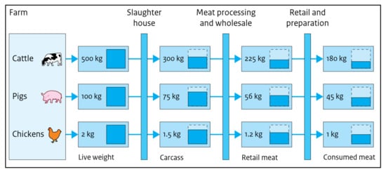 From farm to fork, meat losses are spread across the FSC, starting with primary production, where mortality and disease are the main causes of losses, followed by slaughter and processing, due to the removal of inedible parts. Consequentially, the percentage of retail saleable meat from the carcass weight is approximately 45% for ruminants, 56% for pigs and 60% for chickens. However, in the final stages of the meat supply chain, there is still meat waste, corresponding to about 20% of the meat available in the retail sector (Figure 8) [48].