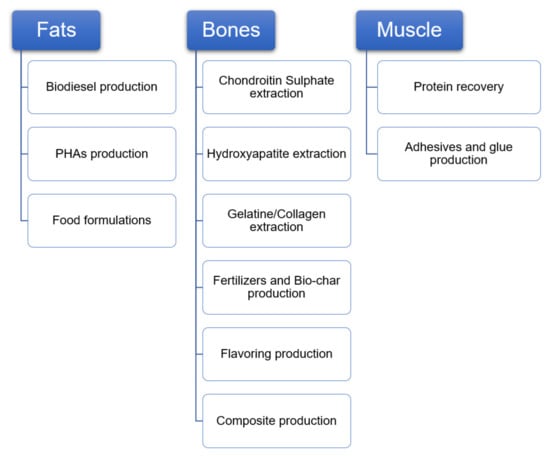 The remainder of the paper is as follows. Section 2 describes the methodology used for the review. Section 3 provides a contextual analysis on food losses and waste in the agro-food sector, which is further explored specifically in relation to the meat sector in Section 4. Section 5 provides a review of waste valorisation pathways of animal by-products (meat, fats and bones) with respect to emergent and industrial-scaled processes. A discussion and final conclusions are presented in Section 6.